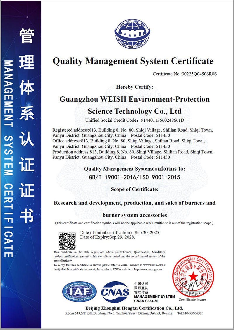 ISO9001质量管理体系认证是全球质量管理领域最具影响力的权威认证之一,其核心在于通过系统化的流程管理、持续改进的机制以及对客户需求的精准响应,确保产品与服务的高质量交付。此次认证覆盖的业务范围——燃烧器及燃烧器系统配件的研发、生产和销售,是威旭环保的核心战略领域。