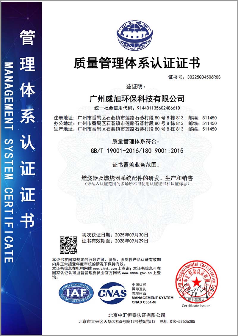 ISO9001质量管理体系认证是全球质量管理领域最具影响力的权威认证之一,其核心在于通过系统化的流程管理、持续改进的机制以及对客户需求的精准响应,确保产品与服务的高质量交付。此次认证覆盖的业务范围——燃烧器及燃烧器系统配件的研发、生产和销售,是威旭环保的核心战略领域。